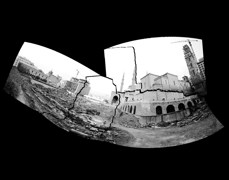 Johnny Alam Montreal, Canada A Palimpsest of Crises (2015) Digital print. Courtesy of the artist The Venetian inspired tower of Saint George’s Maronite Cathedral on the right of this image was built in response to the controversial construction of the adjacent Mohammad Al-Amin Mosque which dwarfed this cathedral. This competition to dominate the city’s skyline and the image of the nation is, however, undermined by the underlying archeological ruins of the Roman Empire that attest to the transient nature of power. Conversely, this landscape represents a viable mode of cultural coexistence that is ungoverned by typical majority-minority relationships. In 1997, Pope John Paul II declared that “Lebanon is more than a country, it’s a message of peace and coexistence between the East and the West.” This message is conveyed by the olive trees planted at the center of this site by three American mothers, in memory of their sons who passed away in the 9/11 attacks on New York. |